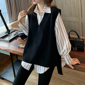 法式秋冬宽松条纹衬衫加肥加大码女装新款显瘦上衣背心...
