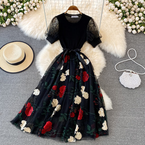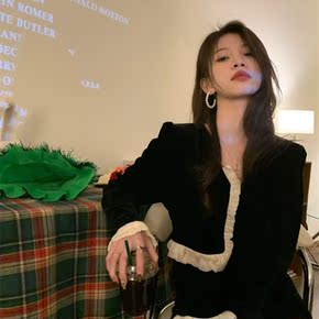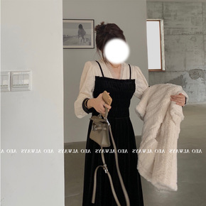 实拍 丝绒假两件连衣裙女冬季花边显瘦高腰黑色...