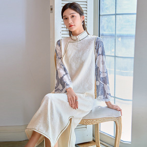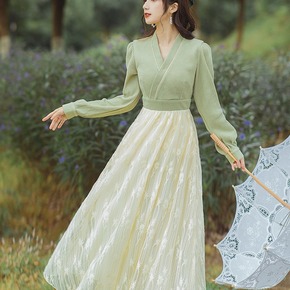 实拍 V领复古文艺风女装汉元素国风拼接长袖连衣裙...