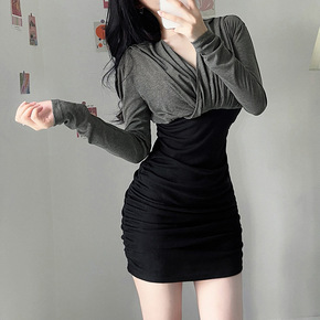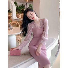 温柔气质大小姐 显瘦优雅性感紧身包臀V领长袖粉纱曼...