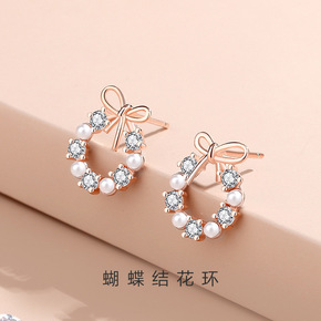蝴蝶结花环耳钉女韩版小清新小众镶锆贝珠耳饰小红书同...