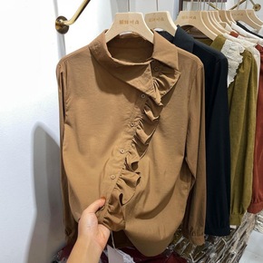 欧货别致荷叶边斜扣长袖衬衫女早秋新款法式设计感小众...
