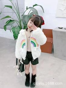 网红爆款彩虹毛毛衣女童秋冬加棉拉链衫卡通刺绣女孩外...
