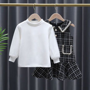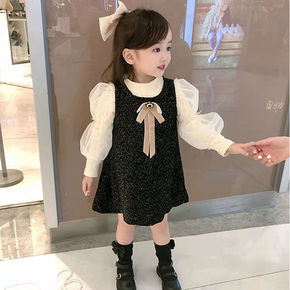 女童秋冬新款洋气加绒女宝宝冬装黑色小香风两件套背心...