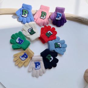 宝宝B字母针织分指手套秋冬天水貂绒儿童保暖手套防风...
