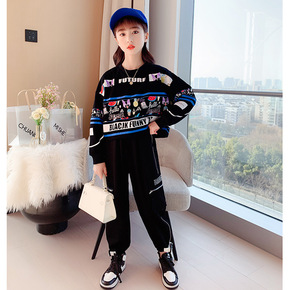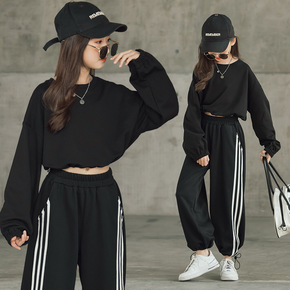 女童春装黑色卫衣套装2022新款中大童春季女孩春秋...