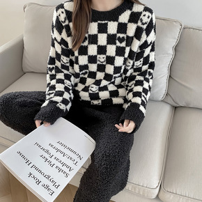 秋冬新款仙女暖宝宝珊瑚绒棋盘格加厚保暖圆领家居服套...