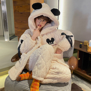 睡衣女秋冬季珊瑚绒加厚连帽三层夹棉保暖卡通女孩甜美...