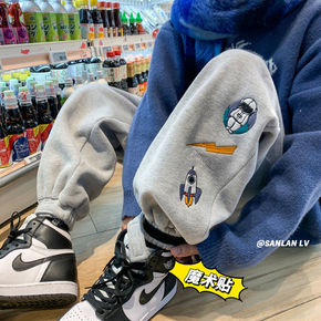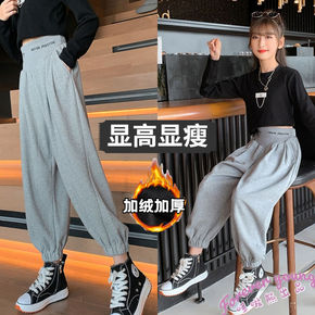 2021冬季新款加绒加厚英伦风阔腿裤螺纹哈伦裤松紧...