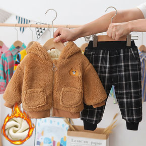 格子卡通卫衣男女宝宝套装秋冬款加绒0一4岁小童卡通...