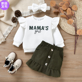 跨境童装女宝宝秋冬季新款加绒字母飞袖卫衣 灯芯绒套...