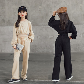 女童套装2021秋冬新款小灯笼袖短款卫衣直筒裤套装...