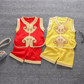 夏季宝宝儿童婴儿唐装周岁生日百天黄马褂满月礼服抓周...