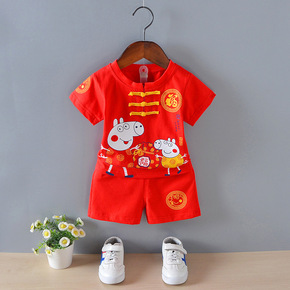 儿童唐装套装男童中国风红色棉绸如意福夏幼儿抓周衣服...