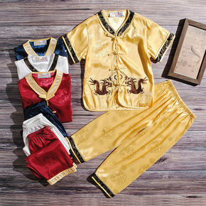 儿童民族风汉服套装男童复古风唐装短袖宝宝周岁抓周服...