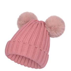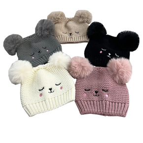 欧美时尚冬季新款双毛球毛线帽套头帽女童儿童卡通针织...