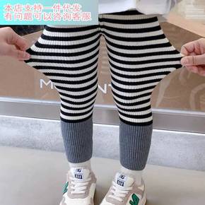 宝宝加绒女童打底裤针织条纹童裤精梳棉中小童春秋冬款...