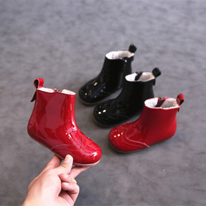 天使童鞋漆皮2021新款秋冬季加绒儿童亮皮短靴防滑...