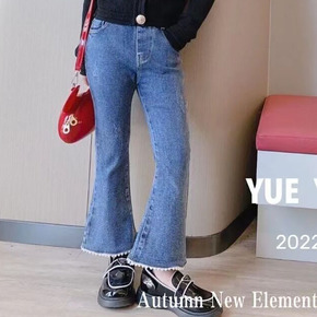 品质女童弹力牛仔裤2022秋款珍珠边脚口喇叭裤弹力...