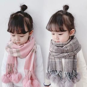 儿童围巾秋冬加厚保暖格子围脖男女童兔毛球仿羊绒流苏...