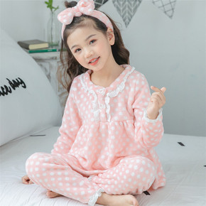 女童睡衣法兰绒可爱卡通宝宝小公主保暖秋冬圆点加绒中...