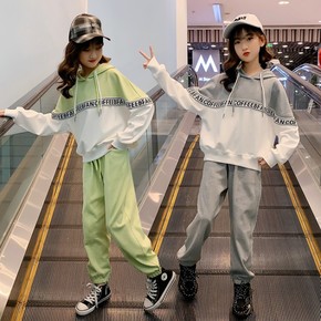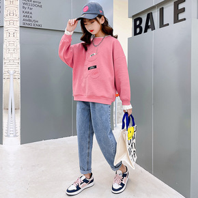 女童春秋套装大童拼色韩版宽松女孩休闲连帽卫衣牛仔裤...