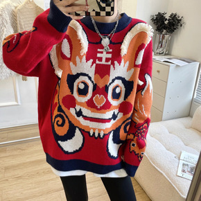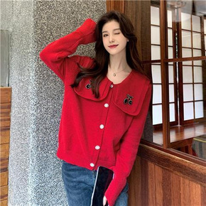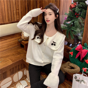 2022秋冬新款减龄娃娃领樱桃刺绣红色毛衣女港风复...