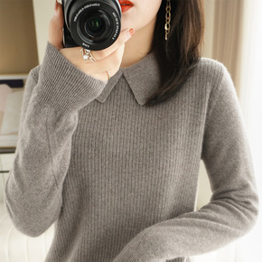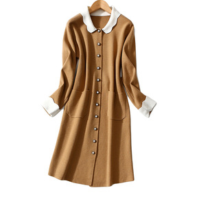 2021秋冬款精致娃娃领撞色小香风珍珠扣针织羊毛连...