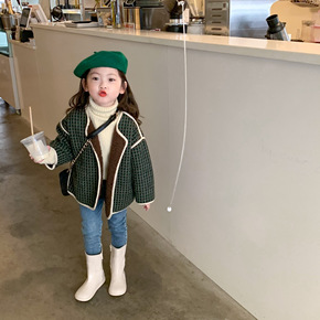 2021秋冬新款童装一件代发 女童加绒格子包边外套...