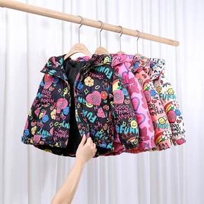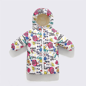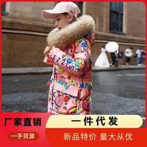 羽绒服女童2021冬季新款涂鸦连帽中大童短款宽松卡...