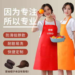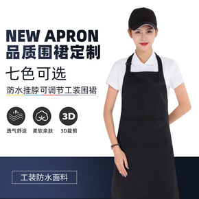 涤纶挂脖围裙免费印字logo广告工作服女防水背带厨...