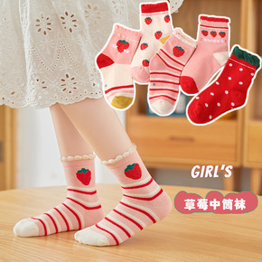 儿童袜子秋冬新款可爱草莓女童中筒袜 韩版花边女孩中...