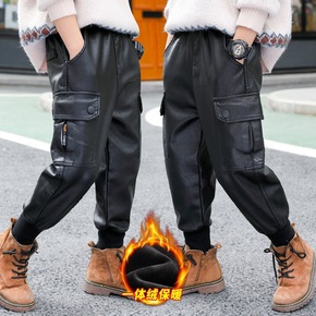 男童工装皮裤一体加绒加厚冬装2021新款中大童保暖...