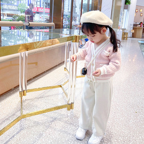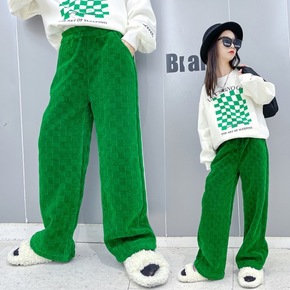 提花格子高腰阔腿裤女童秋冬2021年春秋新款直筒休...