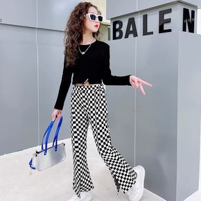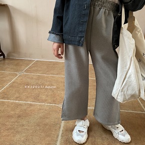 女童裤子2022新款宝宝时髦夏款洋气开叉格子喇叭裤...