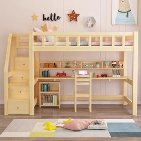 。实木高架床儿童成人床小户型上床下桌省空间单上层带...