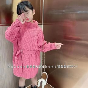 女童毛衣中长款秋冬加厚针织连衣裙洋气淑女高领打纯色...