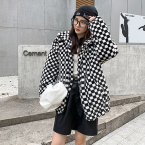 2021年新款黑白棋盘格皮草外套女中长款宽松仿兔毛...
