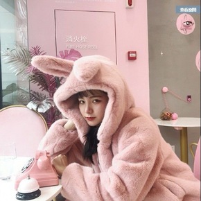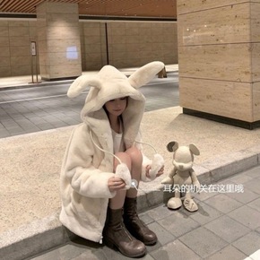 2020秋冬新款加厚连帽兔耳朵毛绒加厚外套大衣仿獭...