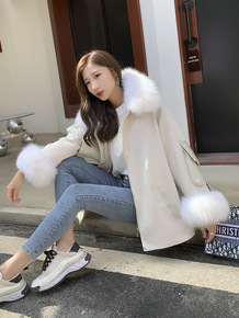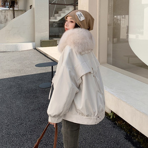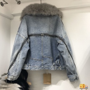 秋冬季韩版兔毛内胆牛仔派克服女宽松狐狸毛领皮外套大...