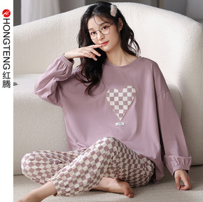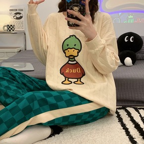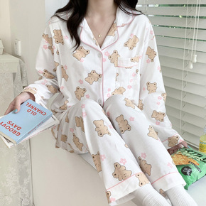跨境外贸秋季新款睡衣女全棉格子小熊ins时尚长袖家...