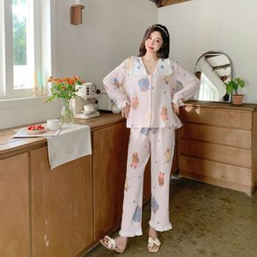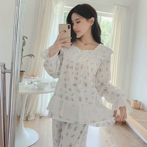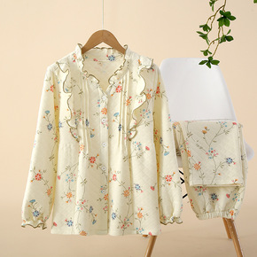 全棉空气层小花套装女士 秋冬季简约睡衣长套 保暖开...