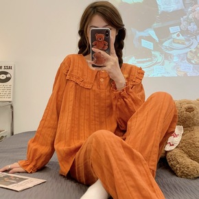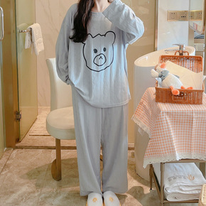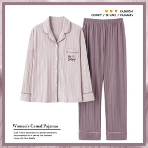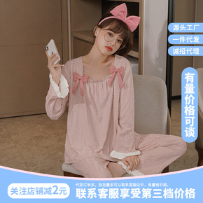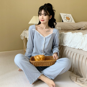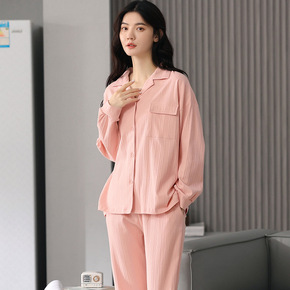 2022秋季新款睡衣女春秋长袖坑条棉薄款套装韩版甜...