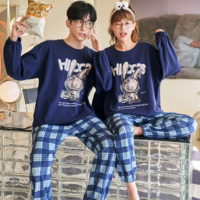 新款春秋季情侣睡衣女秋精梳棉男长袖长裤套装家居服卡...