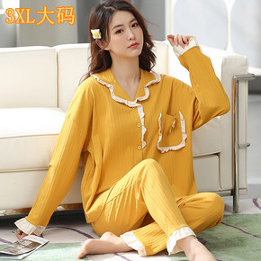 3XL大码睡衣女春秋季长袖开衫翻领纯色精梳棉公主学...