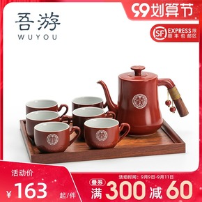 创意红色陶瓷功夫茶具礼盒装套装茶壶茶杯茶盘结婚礼品...