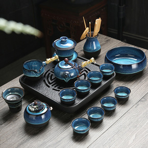 窑变整套功夫茶具套装家用陶瓷建盏茶壶盖碗茶杯镶银瓷...