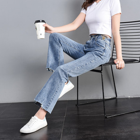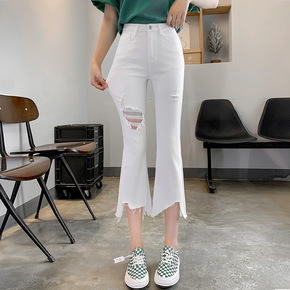 高腰破洞弹力牛仔裤小个子2022夏新不规则女修身显...