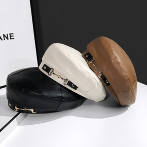 批发金属扣皮质贝雷帽子女秋冬款日系英伦pu皮帽复古...