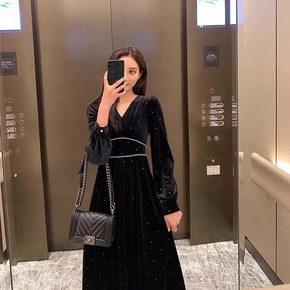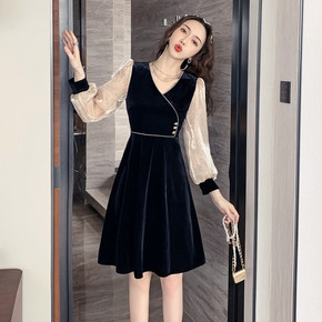 女装2021秋冬新款 时尚韩版中长款名媛气质V领长...